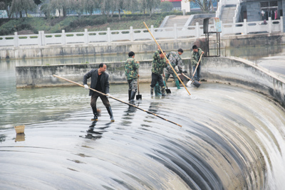 为确保"四城联创"稳步推进,13日,县住建局深入城区街头、公园、河道、景点主要工程节点,督办检查绿化、亮化、规范化、秩序化、设施完善化“六化”迎检落实情况。图为工人们正在清理西河公园橡皮坝和河水中的垃圾。 (陈锐 张均 吴量 摄)