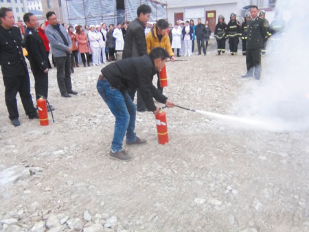 县消防中队教官从如何报火警、火灾的预防、火场自救及逃生方法等消防安全基本常识进行了讲解,现场演示了灭火器的使用程序。随后,模拟了大型火灾逃离演习,随着发令声的响起,医务人员依据规定的疏散路线带领患者用湿毛巾捂住口鼻、弯下身体,冷静有序地快步下楼疏散到了操场,整场演习用时5分钟,演练活动紧张有序。