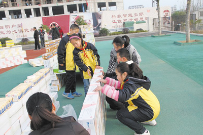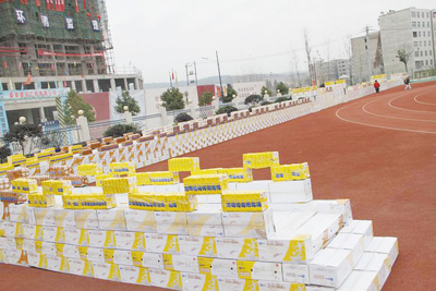 近日,县东城小学的操场上展出了一副用牛奶盒制成百米“长城”,成为该校区一道靓丽的风景线。 据了解,“百米长城”长102米,宽1米,高1米,所有材料全用学生饮用奶纸盒拼制而成,共用了大包装盒1800多个,小盒3万多个,历时2周完成的,举办此次活动旨在增强学生创新能力和环保意识。图一为百米“长城”一角;图二为师生正在共同搭建“长城”。