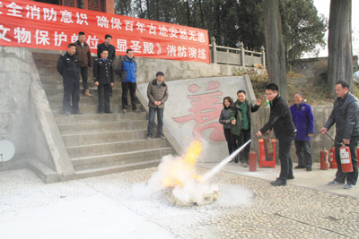 近日,显圣殿文管所进行了消防实战演习,并向工作人员和游客及文物点周边群众开展文物建筑防火,灭火,火灾自救互救等培训。开展此次演练活动,旨在进一步提高工作人员的安全防范意识和应对突发事件的能力,确保文保单位消防安全。图为工作人员体验使用灭火器。 (卢华 摄)