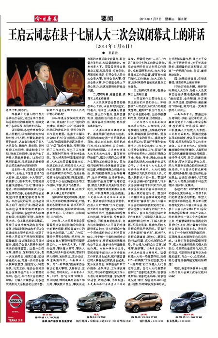 2014年是全面深化改革的第一年,是实施“十二五”规划的关键年,是建设“三化”协调发展示范区的攻坚之年,做好今年的工作至关重要。县委十三届三次全体(扩大)会议提出,以建设“三化”协调发展示范区为目标,以“六区”建设为重点,为我们指明了工作方向,指出了工作重点。发展时不我待,使命神圣光荣。在大好形势和繁重任务面前,人大工作要调整思维方式、创新工作方式,积极探索人大工作的新思路、新形式,行使好宪法和法律赋予的职权,促进全县经济社会快速发展,跨越发展。为实现本次会议确定的各项工作目标,下面,我讲几点要求: