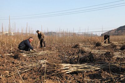 核桃产业是全市“四个百万工程”之一,我县依托自然资源禀赋,选育自主知识品牌的“房陵一号”和引进“清香”品种繁育苗木2000亩 ,今冬明春可出圃核桃苗木120万株,满足全县发展核桃产业种苗需求。截至目前,全县已发展核桃基地45.8万亩。图为付家湾中心苗圃职工在高桥村核桃育苗基地起苗。 (陈立煌 摄)