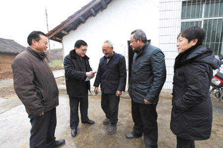 11日,县国土资源局局长张祖元(左二)等班子成员来到贫困老党员万大生家中慰问,并送去500元现金。为了帮助驻点村——尹吉甫镇双湾村30多户困难农户,该局干部职工积极捐款1万多元,帮助他们安全过冬。 (赵爱平 周海 摄)