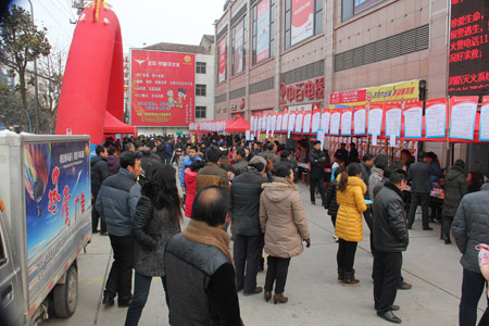 11日,我县2014年“春风行动”第二场大型招聘会现场人头攒动。据悉,此次活动由县人力资源和社会保障局联合县总工会、团县委等相关单位共同组织,为本地企业专场招聘会。现场与会企业达55家,为求职者提供就业岗位2100余个,涉及纺织、医药、汽配、餐饮、文教等行业。活动吸引2000多人进场咨询,预计达成求职意向800多人。 (毛俊杰 摄)
