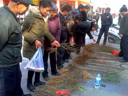 近日,笔者在市场上一处苗木摊前看到,不少群众在选购果树苗木,春节过后正是栽种果树苗木的黄金时节,市场上各种果木苗渐渐俏销起来,苗木培育户纷纷把树苗投入市场,收获新春的第一桶金。近年来,我县逐步加大农业特色产业化发展力度,经果林木成为广大农村群众的抢手货。(陈涛 摄)