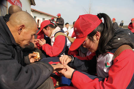 图为城关四中的青年志愿者正在为福利院孤寡老人修剪指甲