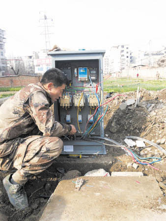 为确保城区路灯、亮化正常运行,近日,县路灯管理所组织工作人员对全县60余处路灯控制点进行隐患大排查,对设施陈旧、老化的控制箱进行整改、更换。截至目前,已更换路灯控制5处。图为工作人员正在整改路灯控制箱。(全娟 摄)