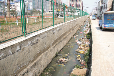 随后,记者随张女士来到位于东城小学与党校小区之间的另一处臭水沟。据介绍,这条沟的水从“三八渠”流下来,一直通到孙家湾河,经过党校小区的长度有百米左右,以前渠水主要用于农田灌溉。记者看到,沟内同样扔满各类生活垃圾,水呈黑色,还未走近,就已经闻到阵阵恶臭。这条渠没有铺盖板,社区路又很窄,东城小学学生放学从这里走十分危险,已经发生过好几起事故,居民也对此怨声载道。记者在东城小学采访时,不少学生和老师都反应“确实该管管了,太影响我们正常的教学生活了,最好能铺上盖板,这样我们走这条路也能安心点”。