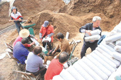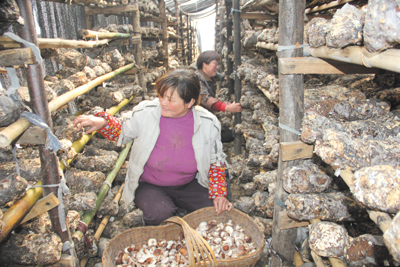11日,笔者在青峰镇峪坪河村看到,村民们正在将处理后的培养基装袋。今年,该镇将食用菌作为农业主打产业之一,仅峪坪河村袋料食用菌产量可达210万袋,预计全镇代料香菇产量将达到510万袋。图一为村民正在装袋;图二为村民采摘鲜菇。 (杨鹏 张斌 摄)