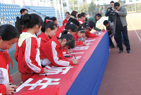 17日,东城小学启动“创文明城,做文明人”主题实践活动,拉开了新一轮创建全国文明城市工作的序幕。启动仪式上,全校近500名师生在写有“创文明城,做文明人”的条幅上郑重签名,写下了自己积极投身此次活动的承诺。(李英 摄)