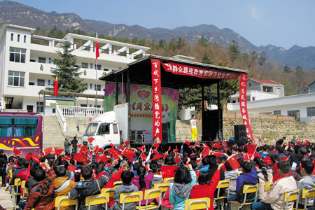 近日,十堰市农商银行来我县组织开展了“百戏下乡”大型文艺巡回演出活动,为当地群众送上了丰富的精神文化大餐。据悉,此次“百戏下乡”活动在我县部分乡镇进行了15场演出,采用歌舞、快板、小品等多种节目形式,生动地诠释了党的群众路线教育实践活动的目的及意义,并使广大群众乐享文化惠民成果。 (戢浩 金帅 摄)