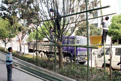 近日,尹吉甫镇“三镇联创”办公室绿化工人正在给集镇街道旁栽种的绿化植被和风景树架设遮阳棚、浇水和输营养液,为绿化植被和风景树提供有效保护。今年来,尹吉甫镇以争创市级文明乡镇、卫生乡镇、园林乡镇为目标,深入开展集镇环境卫生整治,扩大集镇园林绿化面积,完善集镇下水道、路灯、视频监控等基础设施投入。目前,集镇修建大理石花池150多个,铺设路沿石1180米,种植风景树150多株,种植绿化植物1000平方米。