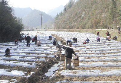 连日来,红塔镇南潭村茶农挥起铁镐正在栽植无性系良种茶苗。据了解,南潭村是我县主要的茶叶生产基地之一,但该村茶树树龄老化问题突出,茶叶经济效益相对下降。为改变这种劣势,红塔镇高度重视茶产业发展,以建设标准茶园为抓手,以提高茶叶生产经济效益为目的,在南潭实施茶树良种繁育示范基地建设,促进红塔茶叶产业的健康快速发展。截至目前,南潭村新发展无性系良种茶园500多亩。 (赵先华 李勇 摄)
