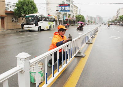 为给市民创造一个良好的生活环境,近日,县环卫所除做好日常保洁外,组织环卫工人对城区主干道的护栏、垃圾箱等设施进行全面清洗。图为环卫工人正在房陵大道擦洗道路隔离栏。