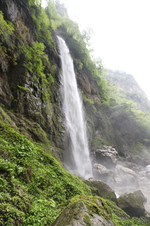 顺着溪流步行约半个多小时后,伴随着虎啸龙吟般的轰鸣声,记者远远看到,一条白布似的激流从陡峭的山崖上飞流直下,给人一种大气磅礴的感觉。惊人的水势带起了强劲的山风,整个山谷中溅起了一片水雾。瀑布下方的怪石被激流冲涮得异常光滑。目测瀑布落差约60米,宽度约5米,比野人谷龙须沟瀑布和青峰镇龙王沟瀑布更为壮观。