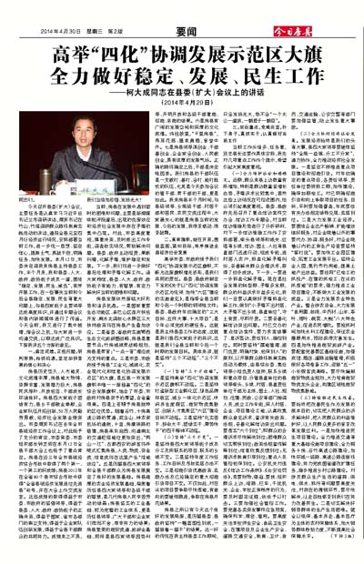今天召开县委(扩大)会议,主要任务是认真学习习近平总书记兰考调研讲话,周霁书记在竹山、竹溪调研群众路线教育实践活动的讲话,通报全县元至四月份经济运行情况,安排部署当前工作,进一步统一思想、坚定信心,提振士气、再鼓干劲,明确任务、加快发展。本月12日,市委决定调我来房县主持县委工作,半个月来,我和县委、人大、政府、政协班子成员一道,围绕“稳定、发展、民生、减负”,有序开展工作,在一些事关当前和今后全县稳定、发展、民生等重大问题上,与县四家班子主要领导达成高度共识,并通过专题会议和县内新闻媒体进行了传递。今天会前,我又进行了集中梳理,借会议之机,与大家进一步沟通交流,以期达成广泛共识。下面我讲五个方面的意见: