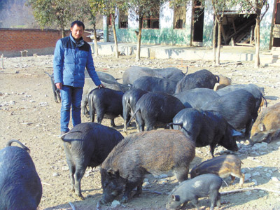12日,五台乡廖河村二组返乡创业青年樊强波正在喂养野猪。樊强波从2012年4月开始林下放养野猪23头,发展到去年 的200多头,销售净利润10万多元。今年,他计划繁养肉猪出栏100头,存栏200头。通过发展林下养猪,他已成为当地致富能手。 (况建强 摄)