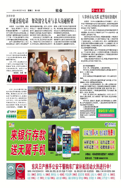 由于父母长期在外务工,与父母见面机会少,留守小学生面临严重的情感孤寂问题。近日,沙河中学设立了一部免费“亲情电话”,让留守儿童能在校内方便地与身处异地的父母沟通,向远在外地的父母汇报学习情况,倾吐思念之情。
