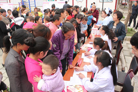 15日,我县在化龙堰镇古城村举办营养包首发仪式,该镇60余名婴儿领到了营养包。据了解,为改善部分地区儿童营养和健康状况,促进儿童生长发育,降低婴幼儿营养不良和贫血率,县卫计局、妇联联合行动,将为全县5000余名6至24月龄婴幼儿发放含有孩子成长必须的优质蛋白、维生素和矿物质等多种营养物质的营养包。图为化龙堰镇当地群众正在领取营养包。(杨鹏 摄)
