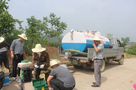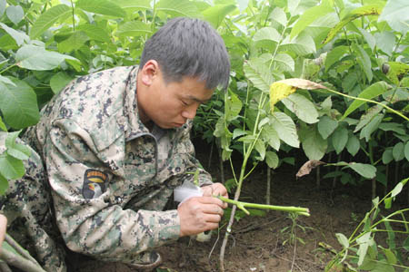 近日,记者在化龙堰高桥核桃育苗基地和竹家垭核桃基地看到,工人们正忙着给核桃幼苗进行嫁接处理和病虫害防治作业。据了解,该镇计划于6月底完成嫁接任务,同时完成1.8万亩防治病虫害作业。图一为村民在高桥基地进行核桃嫁接;图二为村民在竹家垭基地喷药作业。(刘臣 张丽莉 何丽丽 摄)