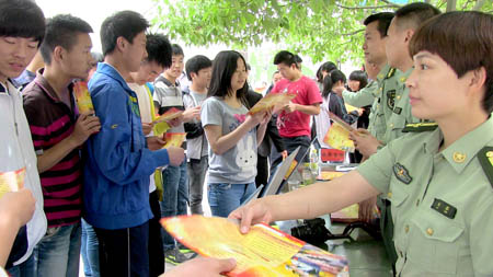从今年起,全国征兵时间调整为夏秋季的8月1日开始征兵。近日,县人武部工作人员到县二中,对今年征兵政策进行宣传,共发放宣传资料1300多份。现场有300多名适龄学生向人武部工作人员表达了应征意向。图为广大学生积极咨询征兵政策。(钟正菊 摄)