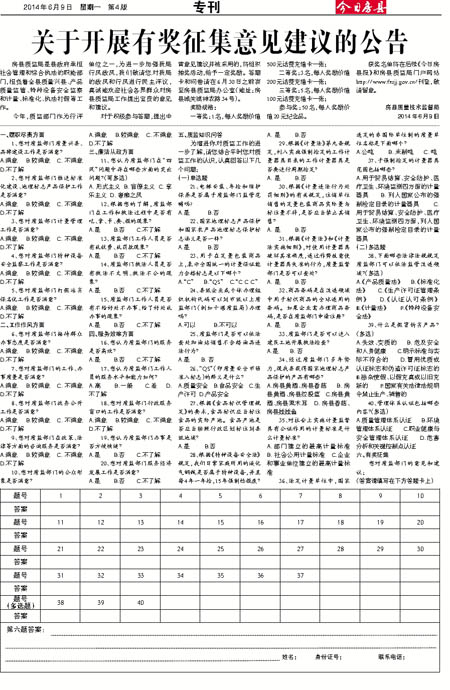 对于积极参与答题,提出中肯意见建议并被采用的,将组织抽奖活动,给予一定奖励。答题卡和问卷请在6月30日之前寄至房县质监局办公室(地址:房县城关镇神农路34号)。