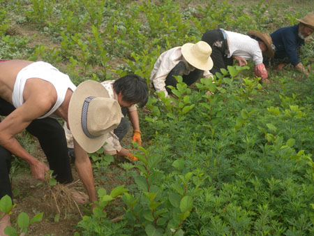 今年,中坝乡下坝村村民熊先安积极响应乡政府发展药材产业的召号,与欣鑫生物科技有限公司签订虎杖种植回收合同,组织农户种植虎杖120亩。截至目前,中坝乡药材种植面积已达4000亩。图为村民正在熊先安的虎杖种植基地除草。(刘忠义 吴风波 摄)