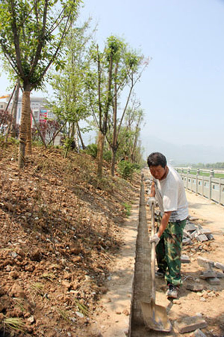本报讯 (记者吴宏强 王玮通讯员张均 吴量) 18日,记者在诗经东路建设施工现场看到,工人们顶着烈日正在进行景观瓷砖铺装以及道路绿化、护坡绿化作业,道路两旁的植绿工程已基本完成,人行道、踏步等市政配套工程建设正快速推进。