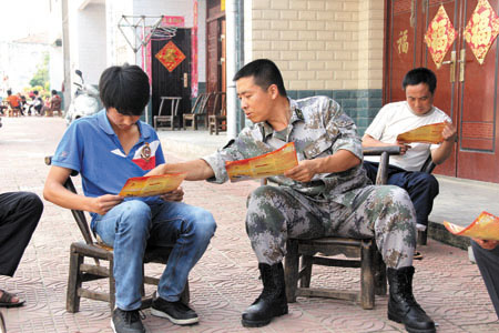 17日,县征兵办工作人员深入沙河乡,进村入户对适龄青年进行征兵宣传和动员,解答今年征兵政策规定,鼓励广大适龄青年踊跃报名应征,做到征兵信息家喻户晓。同时,对适龄青年的现实表现进行调查核实,为提高兵员质量打好基础。