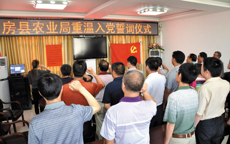 近日,县农业局党委结合党的群众路线教育实践活动,组织局机关全体党员开展了“重温入党誓词,永葆党员先进性”宣誓仪式。活动中,全体党员们面对鲜艳的党旗,高举右手庄严宣誓,重温自己对党忠诚的誓言,表达了为党的事业奋斗终身的决心。(刘林 摄)