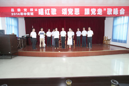 26日,县委党校2014年中青班开展了以“唱红歌 颂党恩 跟党走”为主题的歌咏会,庆祝建党93周年。中青年干部们通过重温入党誓词、红歌联唱、舞蹈等形式,歌颂祖国,歌颂党。(赵爱平 高书文 摄)