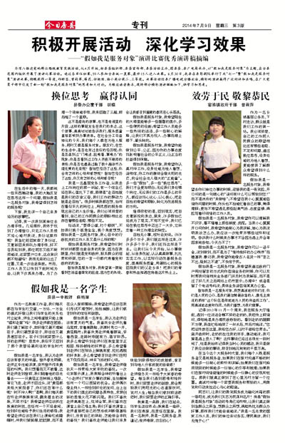为深入推进党的群众路线教育实践活动,从4月开始,由县委组织部、县委宣传部、县委活动主办,团县委、县广电局承办,以“假如我是服务对象”为主题,在全县范围内组织开展了演讲比赛活动。通过各单位初赛,59人参加全县统一复赛,最终15人进入决赛。6月30日,我县在县影剧院举行了庆“七一”暨“假如我是服务对象”演讲决赛,胡蝶获得一等奖,邱娇容、曾莉萍,薛花、任艳丽、杨小英分获二、三等奖。精彩的演讲赢得广泛好评和共鸣,在广大党员干部中引发了新一轮“假如我是服务对象”的思考和大讨论。为顺应读者要求,现将部分精彩演讲摘编如下,供学习和思考。
