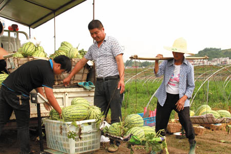 13日,记者在白鹤镇长龙蔬菜基地看到,山东枣庄种植大户刘庆水正在忙碌地为购买西瓜的客户过磅。据悉,该蔬菜基地共流转土地230亩,今年已出售土豆65万斤,西瓜20万斤,收入30余万元。(赵爱平 刘烈建 摄)
