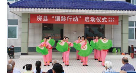 14日,我县 “银龄行动”启动仪式暨关爱空巢老人志愿者活动在县福利院举行。活动现场,县老年登山协会、老年文艺队及老年医务工作者还慰问了福利院老人,并向福利院捐赠了大米、食用油等生活品。今年,我县“银龄行动”以“送医送药送文艺下乡”为主题,突出解决农村空巢老人生活等方面的困难,重点在就医、精神慰藉等方面为农村空巢老人提供优质服务。图为志愿者们在福利院为老人表演歌舞文艺节目。(彭正诚 摄)