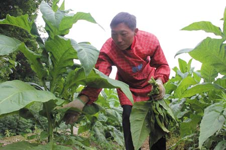 15日,沙河乡火光村村民曾桂树在自家烟地里处理烟叶不适用底脚叶。目前,沙河乡烟农种植的大部分烟株已进入优化烟叶结构、采弃不适用底脚叶的关键时期,为提高烟叶等级结构,提升烟叶品质,满足工业生产需求,该乡已全面启动田间不适用鲜烟叶底脚叶清除工作。(田华锐 刘伟 摄)