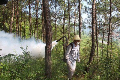 22日,县森防站组织20余名技术人员,深入红塔镇朱湾村松树林开展病虫害防治作业。连日来,受天气等多种因素影响,朱湾村成片松树林遭受到松毛虫、松叶蜂危害,出现枯黄死亡症状。县森防站接到报告后,立即将相关药剂调配到位,采用生物和药物疗法调配白僵菌高孢粉、苦参碱等药剂,采用喷雾机等方式展开防治工作,降低害虫密度,减少和杜绝松毛虫、松叶蜂危害扩散蔓延。