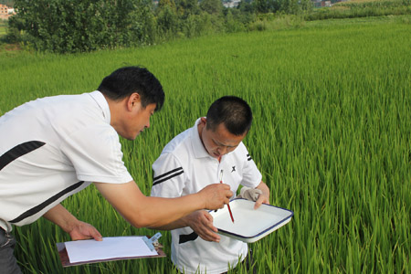 日前,白鹤乡农技推广中心农技员冒酷暑下到田间查看水稻病虫害情况。据了解,全县水稻已进入抽穗期,既是水稻产量形成的关键时期,也是多种病虫害并发危害期,各乡镇农技中心采取多项举措,指导农户加强水稻田间管理,确保今年夏粮增产丰收。 (杨茜 摄)