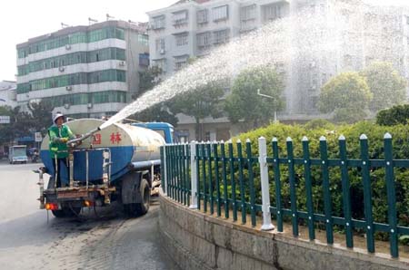 6日下午,记者在唐城路看到,园林部门工人正在给道路边绿化带浇水。持续多日的高温干旱天气让城区园林绿化苗木干渴难耐,连日来,县住建局园林所采取有效措施,安排工作人员在早、晚温度较低的时间段对植物进行浇水,确保绿化苗木不受损。(陈绍杰 谭清云 摄)