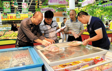 为加强夏秋季食品经营安全监管,13日,县食品药品监督管理局组织执法工作人员对城区大型超市食品安全进行专项整治。据了解,此次专项整治活动自8月1日开始,到10月8日结束,将对我县超市、集贸市场、批发市场和学校食堂、建筑工地食堂、旅游景点景区等重点环节进行检查,对排查出食品安全隐患的食品经营单位,责令限期整改;对问题严重的,依法责令其停止经营,并对整改结果及时进行复查;对涉嫌犯罪的案件,依法及时移送公安机关。 (刘臣 杨春亮 摄)