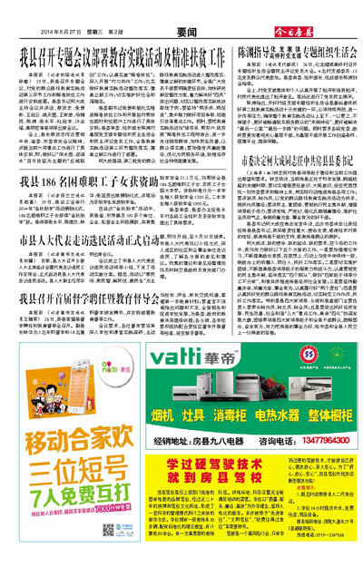 会上,县长蔡贤忠传达贯彻中央、省委、市委有关会议精神,并就当前六项重点工作进行了具体安排,即:做好以“保水质、迎调水”百日攻坚为主题的“五城联创”工作;认真实施“精准扶贫”;深入开展“对口协作”工作;扎实做好教育实践活动整改落实、建章立制工作;切实维护好社会和谐稳定。