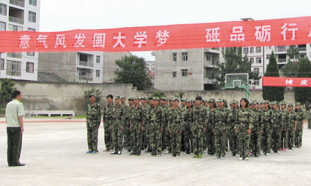为磨练学生“坚韧、能吃苦、不服输”的意志,强化“爱祖国、爱学习、爱集体”的观念,培养“行如风、坐如钟、立如松”的良好行为习惯,近日,县二中举行为期10天的军训活动。图为教官正在为新生校正军姿。(钟正菊 摄)
