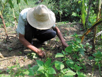 今年以来,门古寺镇大力发展中药材产业,组织农技人员深入田间地头,指导药农种植,采用药粮、药果套种模式,效益良好。截至目前,该镇6000亩药苗长势较好。图为门古寺镇胡家街村民袁天胜忙着给药材幼苗除草、松土、施肥。(王玉兵 摄)