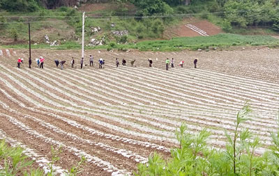 5月27日,野人谷镇千坪村烟农在烟站技术人员的指导下进行田间培土护苗。据悉,该镇今年烟叶种植面积3505亩,预计产量1万余担,产值1200余万元,人均可增收700余元。 (王鹏 官升亮 摄)