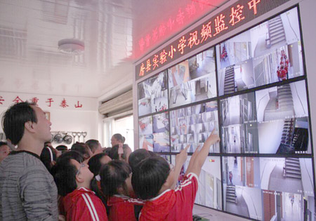 日前,县实验小学投资近30万元的校园视频监控正式投入使用,该视频监控安装有超大屏幕电视墙、一键式报警器等功能齐全的设施设备,可以不间断地对大门外100米处、校门口、楼梯道、操场等校区各个角落实施全程有效监控。(陆晓月 摄)