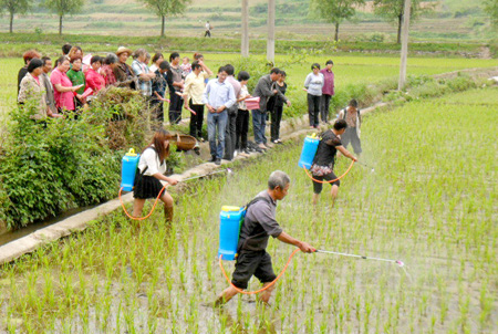 日前,门古寺镇狮子岩村村民在农机专家的指导下对水稻喷洒农药。据了解,该村移栽稻田发生病虫危害,部分秧苗出现生长不良症状,村民拨打“农技110”后,由县农业局组织的“农业科技直通车”及时赶到,农业专家罗建华率领农业技术团队对存在的问题进行会诊,为群众排忧、解难。(王玉兵 摄)