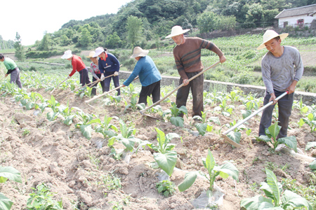 14日,沙河乡火光村6组农民正在为烟苗锄草。今年以来,沙河乡大力发展烟叶产业,截至目前,全乡烟叶面积达到2300多亩,预计全乡烟叶收入可以达到6000多万元;仅此一项农民可人均增收600多元。(赵爱平 刘伟 摄)