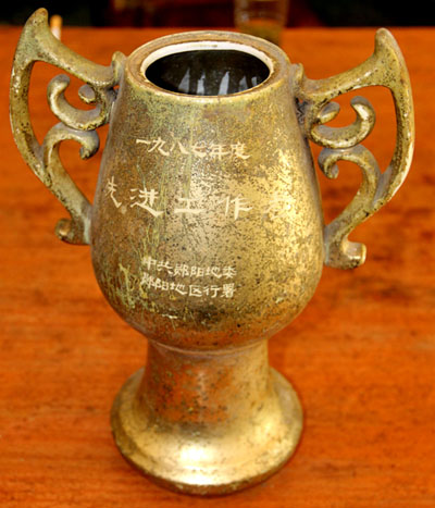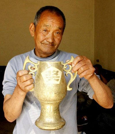 周照秀向笔者展示他获得的原郧阳地委、行署颁发的“先进工作者”奖杯