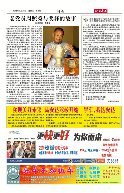 老周本名周照秀,1943年出生,1969年入党,1984年任原榔口乡保林村支部书记,1987年并村后任溜石坡桔场支部书记,1990年唐家沟桔场建成后任桔场支部书记,2004年辞去支部书记职务回到家里,前后他当了20年的村支部书记。他在原保林村当支部书记时,当时主要任务是坡改梯置田置地以及塘、堰、渠、库、水、电、路等农业农村基础设施建设,当时因经济条件限制,全靠出义务工,肩挑背驮,凭人的精神意志去完成繁重工程和农业生产任务。而老周是老党员,群众威信很高,加之他本人凡事亲历亲为,样样争先,事事带头,模范带动,在他的带动下,不管在保林村的坡改梯工程,还是溜石坡桔场的坡改梯工程,以及农村基础设施建设,都完成的又快又好,群众口碑好,县乡领导对他十分信任,最终成为全乡全县全地区的先进标杆。