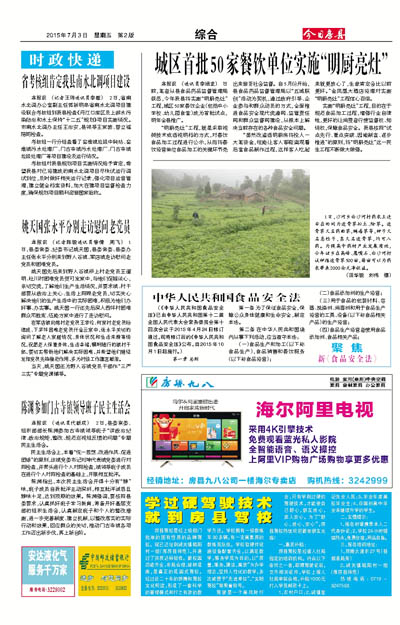 本报讯 (通讯员李绍龙) 日前,笔者从县食品药品监督管理局获悉,今年我县将实施“明厨亮灶”工程,城区50家餐饮企业(包括中小学校、幼儿园食堂)成为首批试点,明年全县推广。