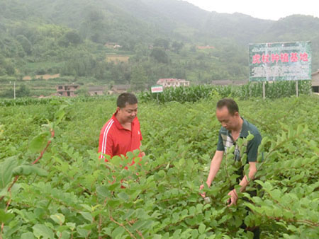 2日,中坝乡下坝村虎杖种植大户熊先安正在查看虎杖长势。据了解,自2014年该乡与三鑫生物药业公司达成合作后,全乡已建成虎杖生长基地950亩,产值可达500万元。(何玲玲 摄